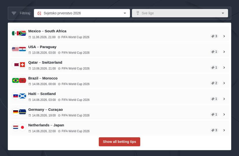 - Pregledajte utakmice dostupne za klađenje u određenom periodu imajući u vidu i trenutne kvote za klađenje na SP 2026.